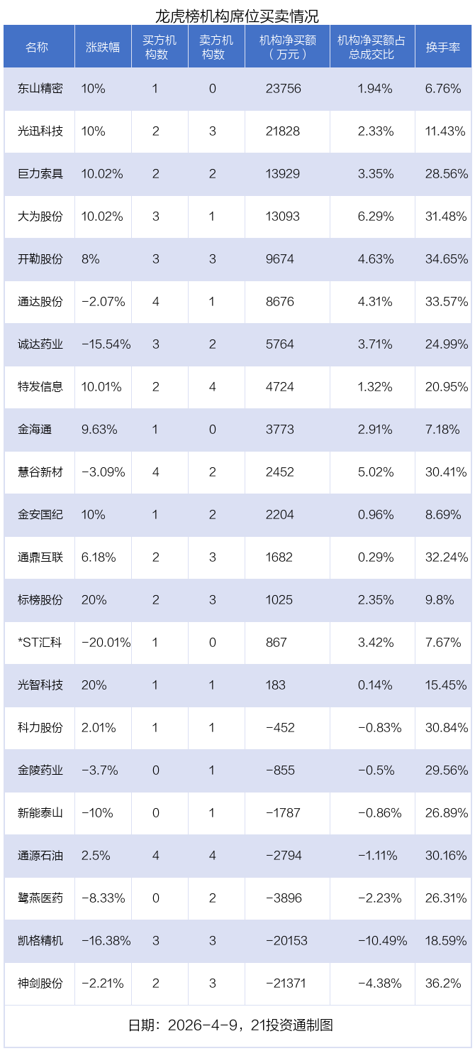 4月9日,22只个股龙虎榜出现了机构的身影,机构合计净买入6.23亿元。具体来看,机构净买入15股,净卖出7股。