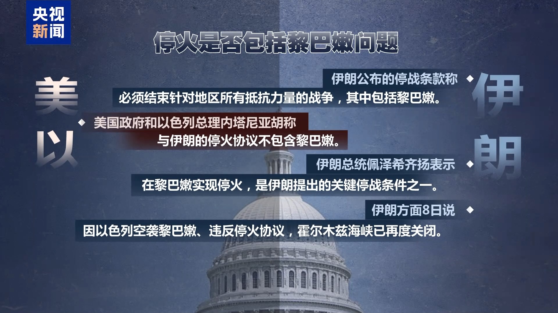 此外,停火是否包括黎巴嫩问题。伊朗公布的停战条款称,必须结束针对地区所有抵抗力量的战争,其中包括黎巴嫩。美国政府和以色列总理内塔尼亚胡称,与伊朗的停火协议不包含黎巴嫩。伊朗总统佩泽希齐扬表示,在黎巴嫩实现停火,是伊朗提出的关键停战条件之一。伊朗方面8日称,因以色列空袭黎巴嫩、违反停火协议,霍尔木兹海峡已再度关闭。