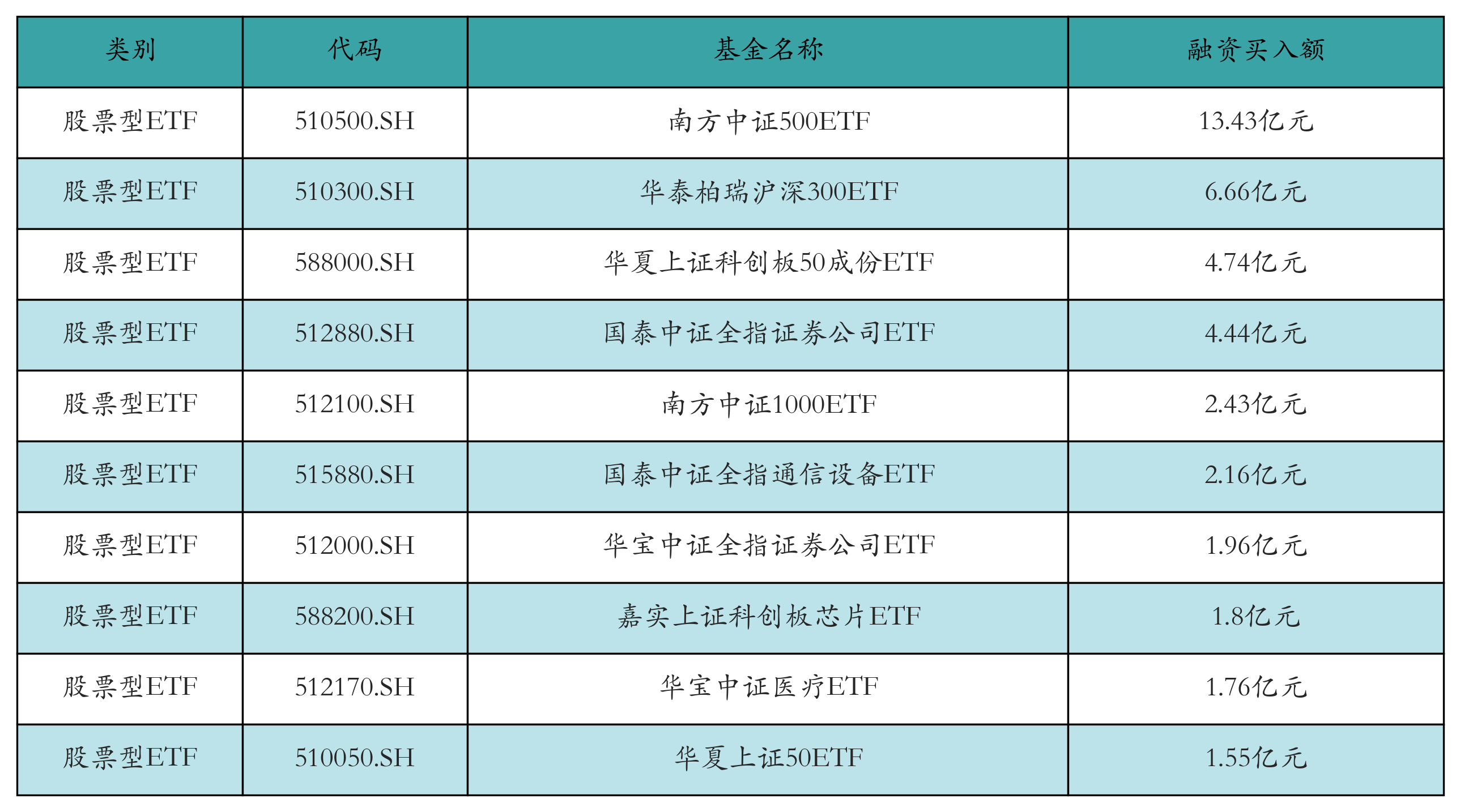 昨日股票型ETF融资买入额最高的3只ETF及其买入金额分别为:南方中证500ETF(13.43亿元)、华泰柏瑞沪深300ETF(6.66亿元)、华夏上证科创板50成份ETF(4.74亿元)。融资买入额前10详情见下表: