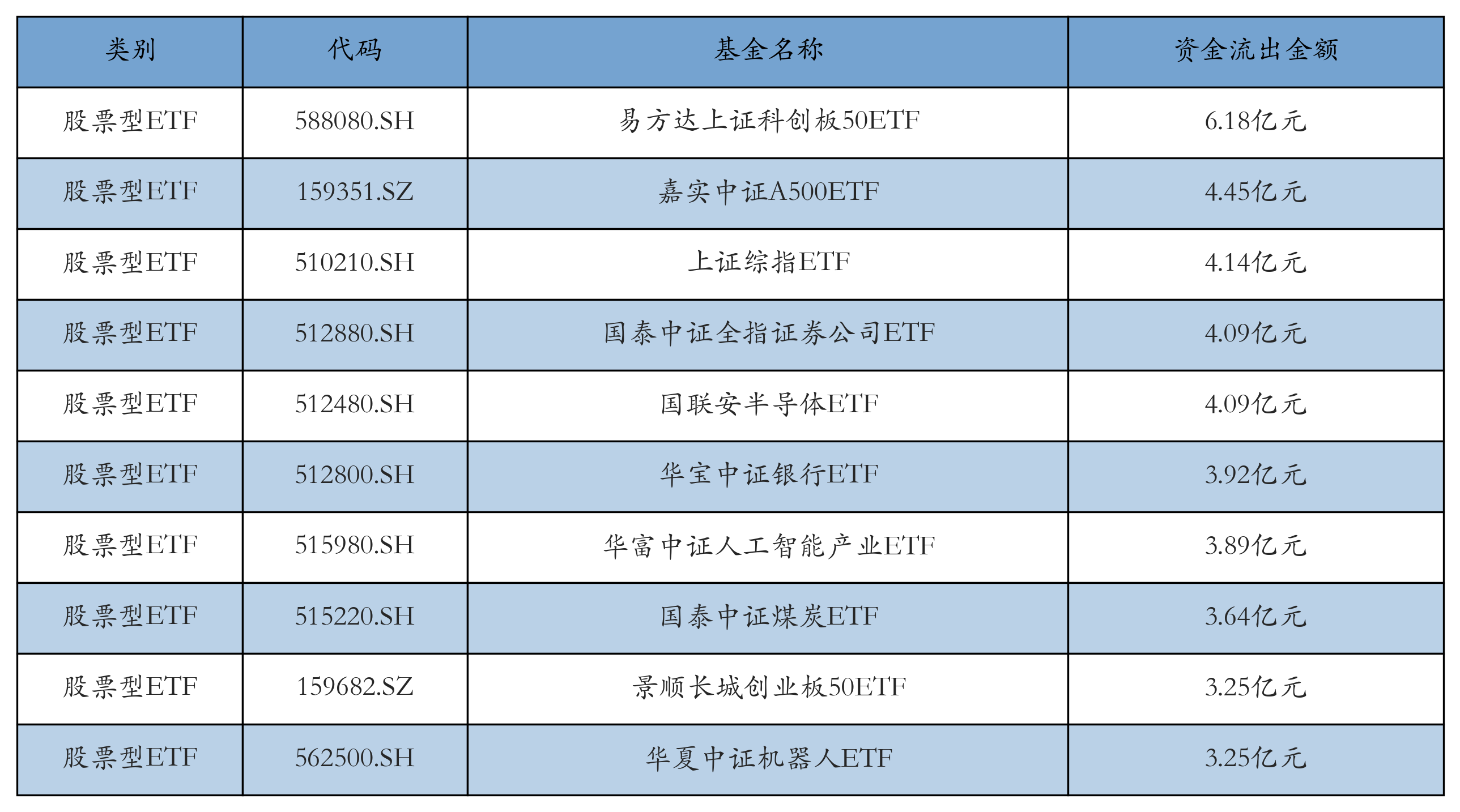 昨日股票型ETF资金流出最多的3只ETF及其流出金额分别为:易方达上证科创板50ETF(流出6.18亿元)、嘉实中证A500ETF(流出4.45亿元)、上证综指ETF(流出4.14亿元)。资金流出前10详情见下表: