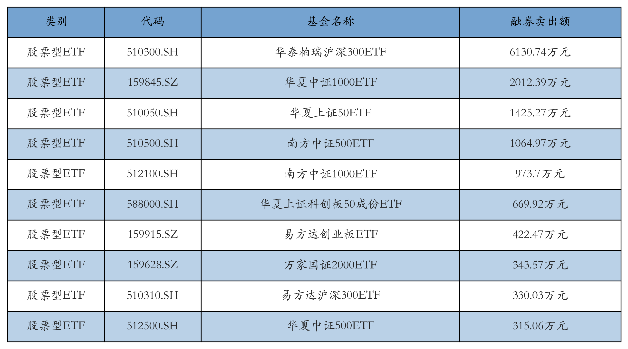 昨日股票型ETF融资卖出额最高的3只ETF及其卖出金额分别为:华泰柏瑞沪深300ETF(6130.74万元)、华夏中证1000ETF(2012.39万元)、华夏上证50ETF(1425.27万元)。融券卖出额前10详情见下表: