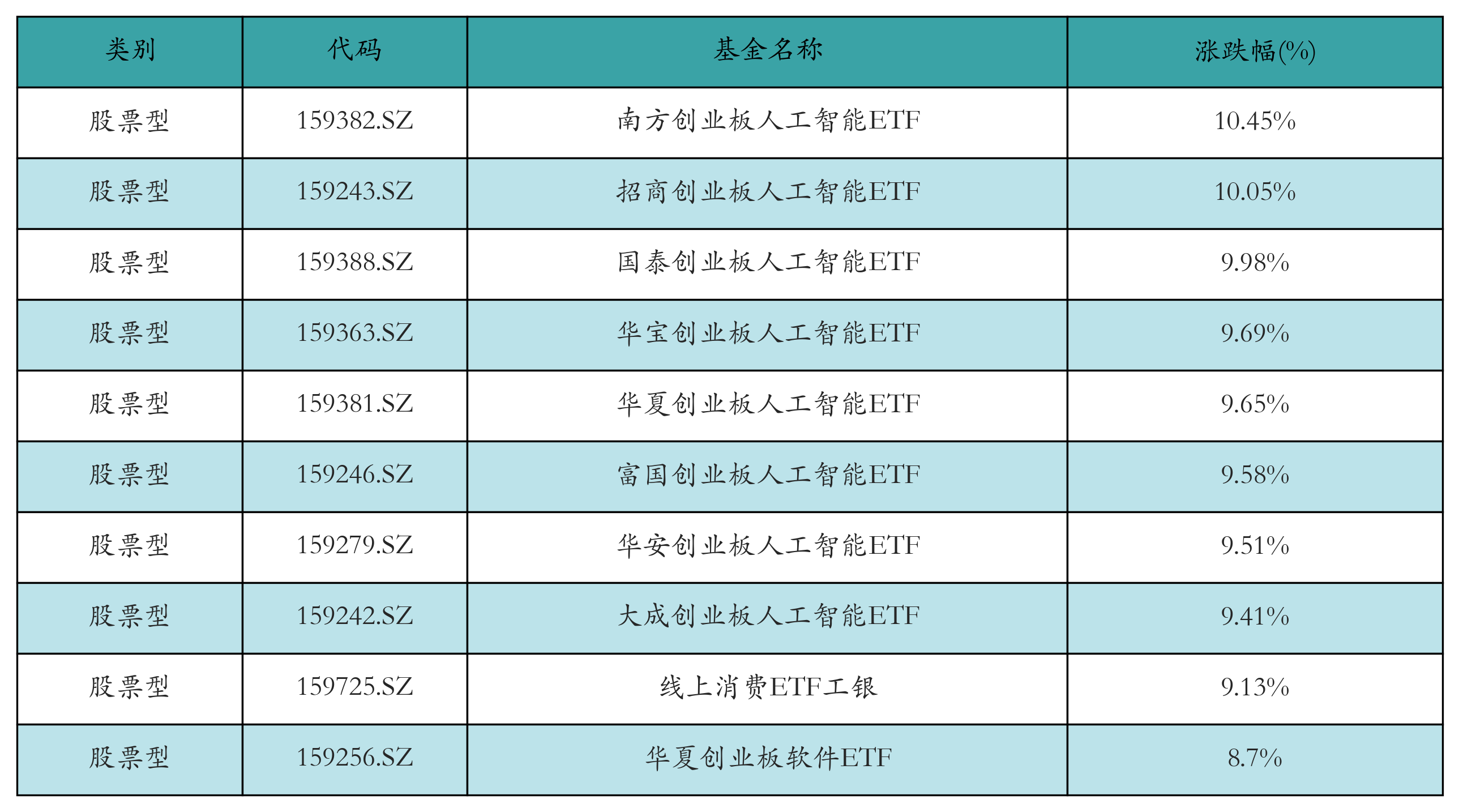 昨日股票型ETF涨幅最高的3只ETF及其收益率分别为:南方创业板人工智能ETF(10.45%)、招商创业板人工智能ETF(10.05%)、国泰创业板人工智能ETF(9.98%)。涨幅前10详情见下表: