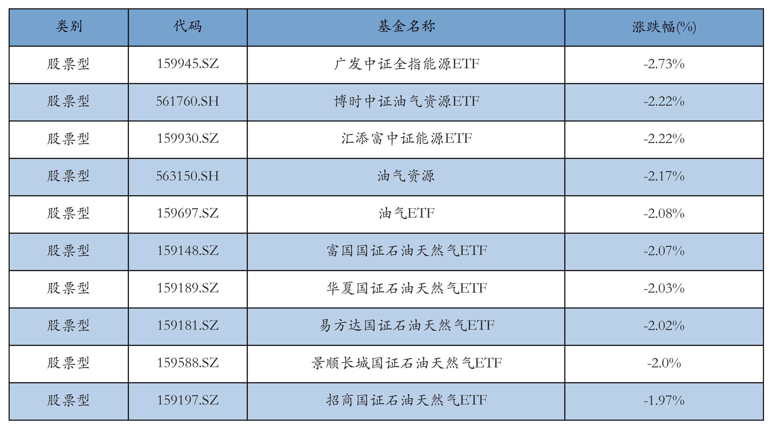 昨日股票型ETF跌幅最大的3只ETF及其收益率分别为:广发中证全指能源ETF(-2.73%)、博时中证油气资源ETF(-2.22%)、汇添富中证能源ETF(-2.22%)。跌幅前10详情见下表: