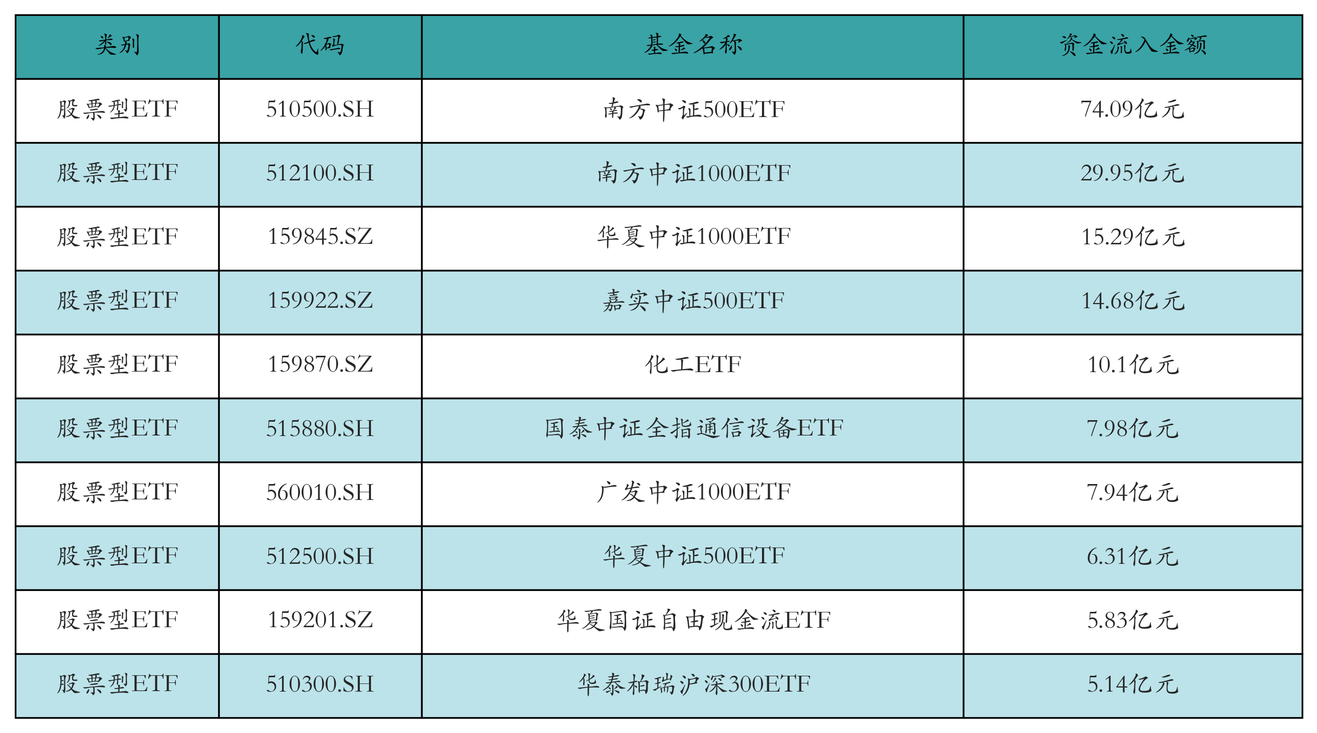 昨日股票型ETF资金流入最多的3只ETF及其流入金额分别为:南方中证500ETF(流入74.09亿元)、南方中证1000ETF(流入29.95亿元)、华夏中证1000ETF(流入15.29亿元)。资金流入前10详情见下表: