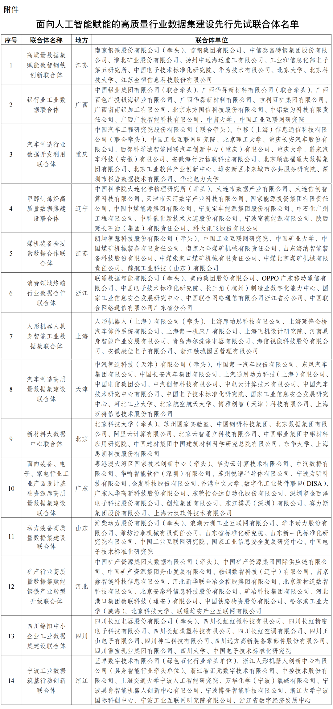 关于公布面向人工智能赋能的高质量行业数据集建设先行先试联合体名单的通知