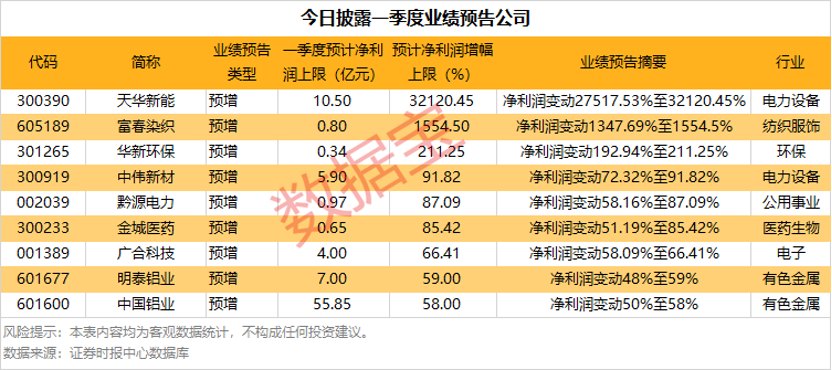 从市场表现看,今日发布一季度业绩预告个股早盘股价全线上涨, 富春染织(605189) 开盘涨停, 天华新能、金城医药 早盘最大涨幅均超10%。