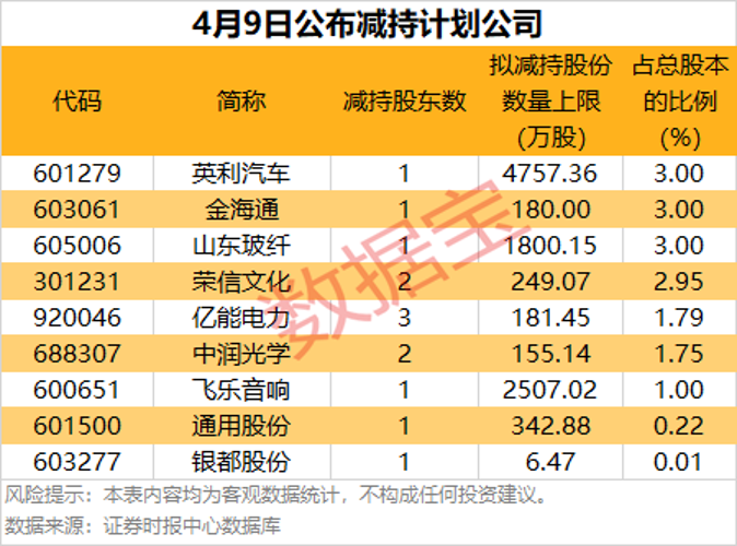 4月9日,9家公司发布了减持计划,拟减持比例居前的有 英利汽车、金海通、山东玻纤 等。
