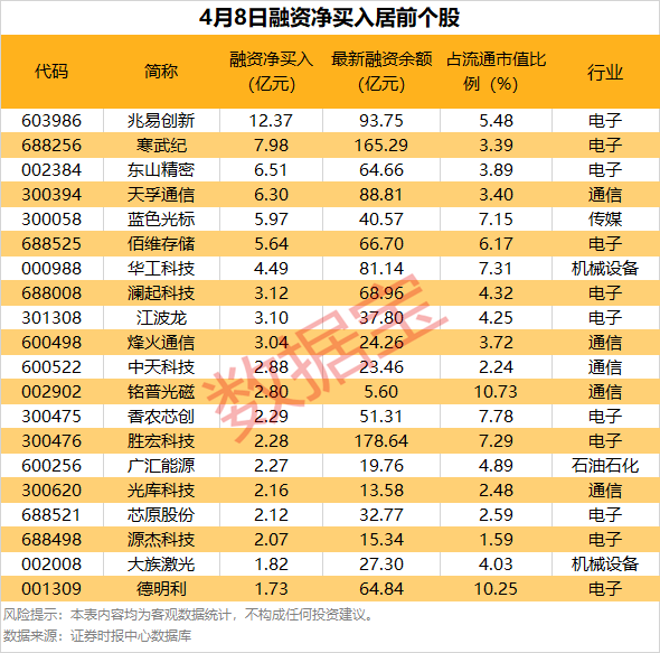 兆易创 新融资净买入额居首,当日净买入12.37亿元;其次是 寒武纪、东山精密 ,融资净买入金额分别为7.98亿元、6.51亿元。融资净买入金额居前的还有 天孚通信、蓝色光标、佰维存储 等。