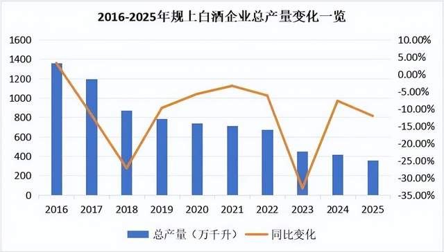当下,中国白酒行业正处于调整期,2025年全国白酒总产量已跌至355万吨,较2016年巅峰期的1350万吨暴跌超70%。