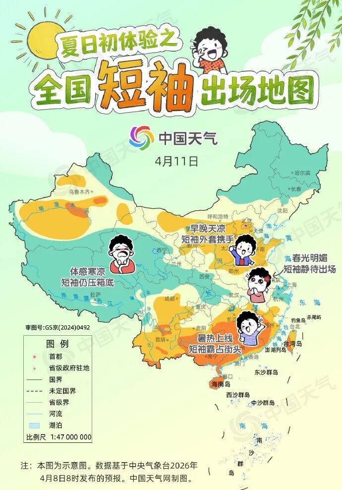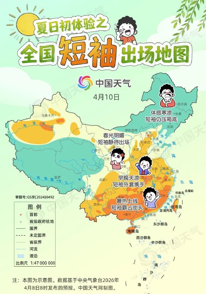 昨日(4月8日)@中国天气 发布全国短袖出场地图, 华南等地气温持续较高,短袖霸占街头 。