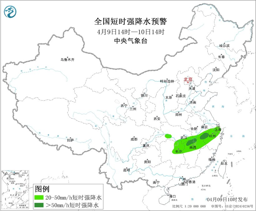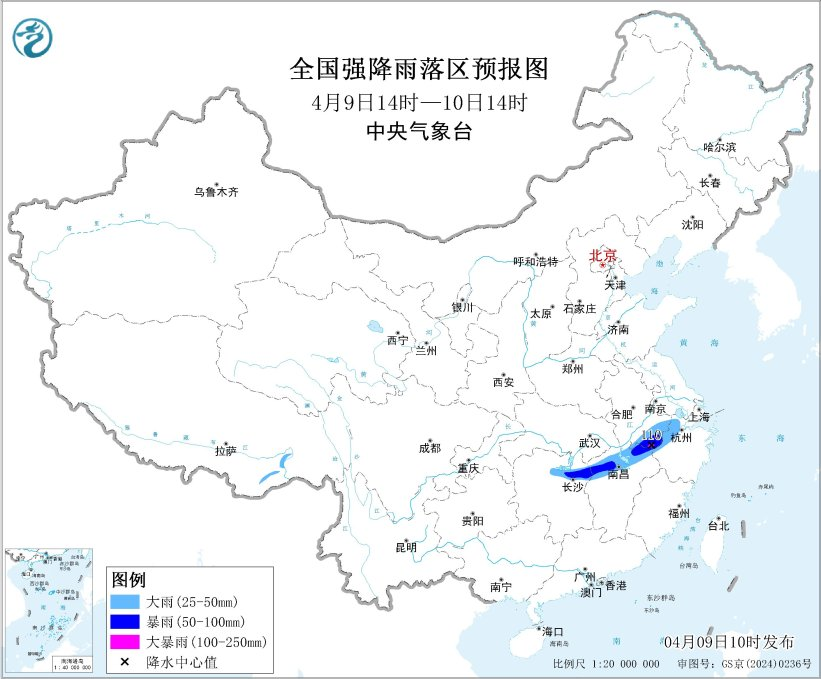 预计, 4月9日14时至10日14时 , 安徽南部、湖南东北部、江西北部、浙江西部等地部分地区有大到暴雨,其中,安徽南部等地部分地区有大暴雨(100~110毫米) 。上述部分地区伴有短时强降水(最大小时降雨量20~40毫米,局地可超过50毫米),局地有雷暴大风或冰雹等强对流天气 。