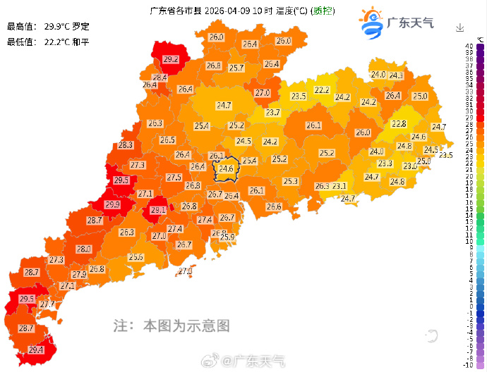 截至今天(9日)上午10时许, 广东 已有6个市县气温超29℃ ,罗定只差0.01℃就破 30℃。