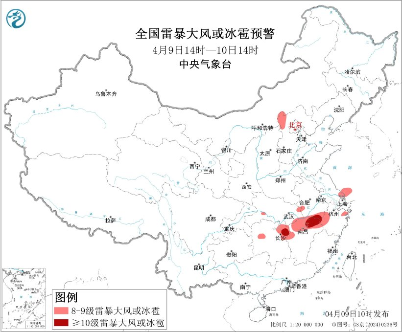 预计 4月9日14时至10日14时 , 江南北部、 河北西北部 等地的部分地区将有8级以上雷暴大风或冰雹天气,其中, 安徽南部、湖南东北部、江西北部等地的部分地区将有10级以上雷暴大风,最大风力可达11级以上 , 局地不排除出现龙卷的可能性 ;江南北部等地的部分地区将有小时雨量大于20毫米的短时强降水天气,其中, 安徽南部、江西北部等地的部分地区小时雨量大于50毫米 。