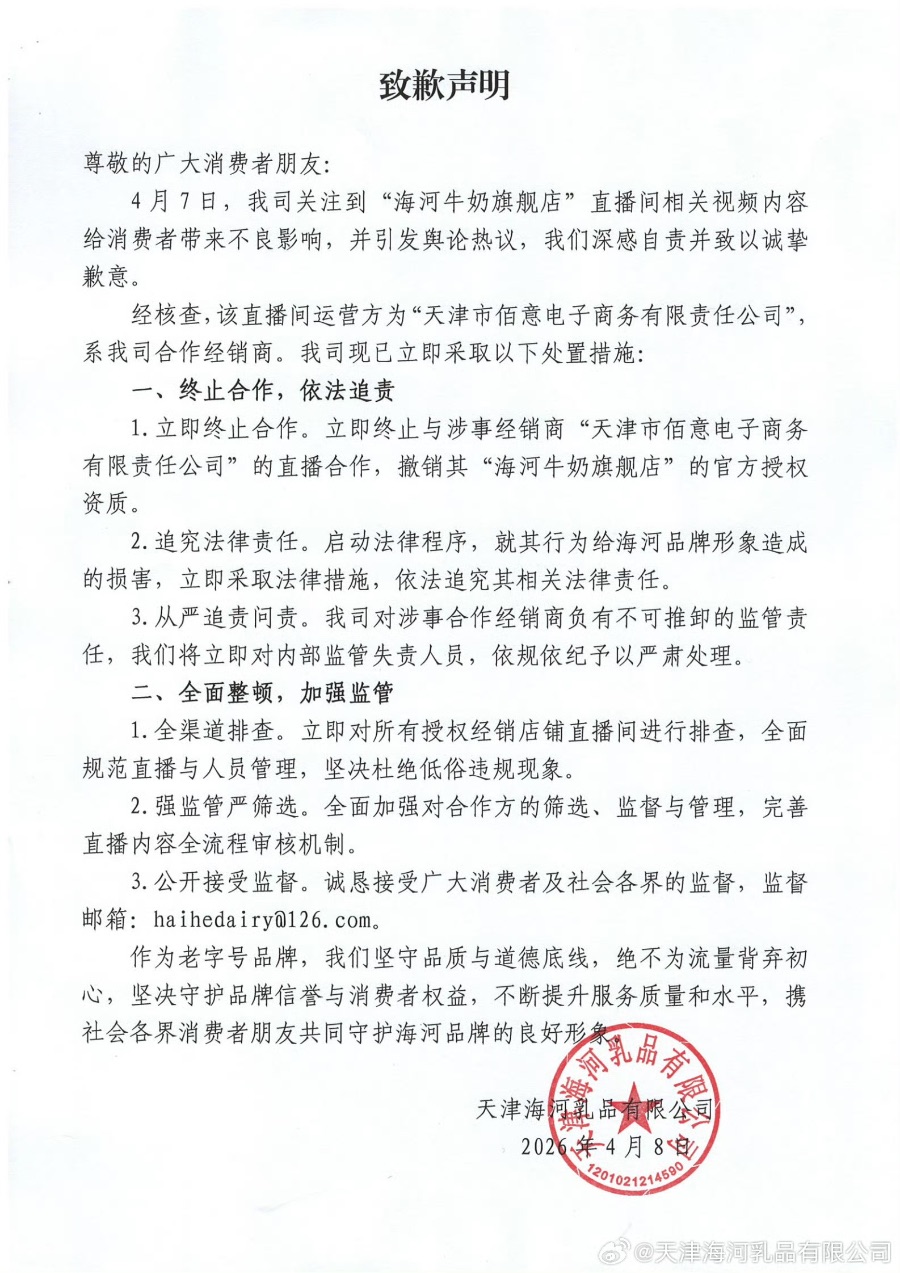 4月8日,海河乳品发布致歉声明称,该公司关注到“海河牛奶旗舰店”直播间相关视频内容给消费者带来不良影响,并引发舆论热议,其深感自责并致以诚挚歉意。经核查,该直播间运营方为“天津市佰意电子商务有限责任公司”,系公司合作经销商。