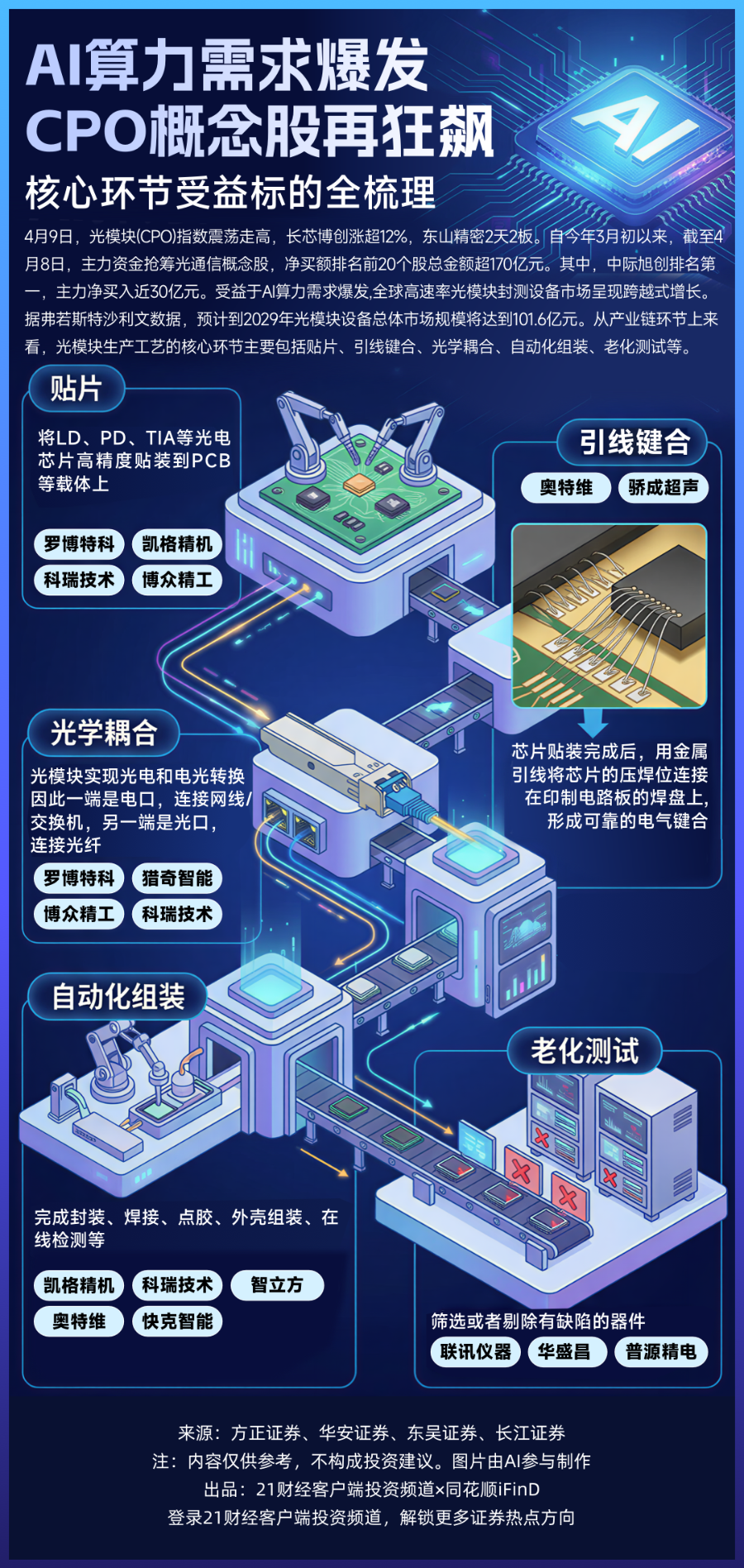 从产业链环节上来看,方正证券指出,光模块生产工艺的核心环节主要包括贴片、引线键合、光学耦合、自动化组装、老化测试等。贴片机、光耦合机、老化测试是最核心的设备。贴片设备(共晶/固晶机)方面,建议关注罗博特科、凯格精机、科瑞技术、博众精工;光耦合方面,建议关注罗博特科、猎奇智能、博众精工、科瑞技术;自动化组装方面,建议关注凯格精机、科瑞技术、智立方、奥特维(AOI)、快克智能(AOI);老化测试方面,建议关注联讯仪器、华盛昌、普源精电;硅光晶圆测试系统方面建议关注燕麦科技。