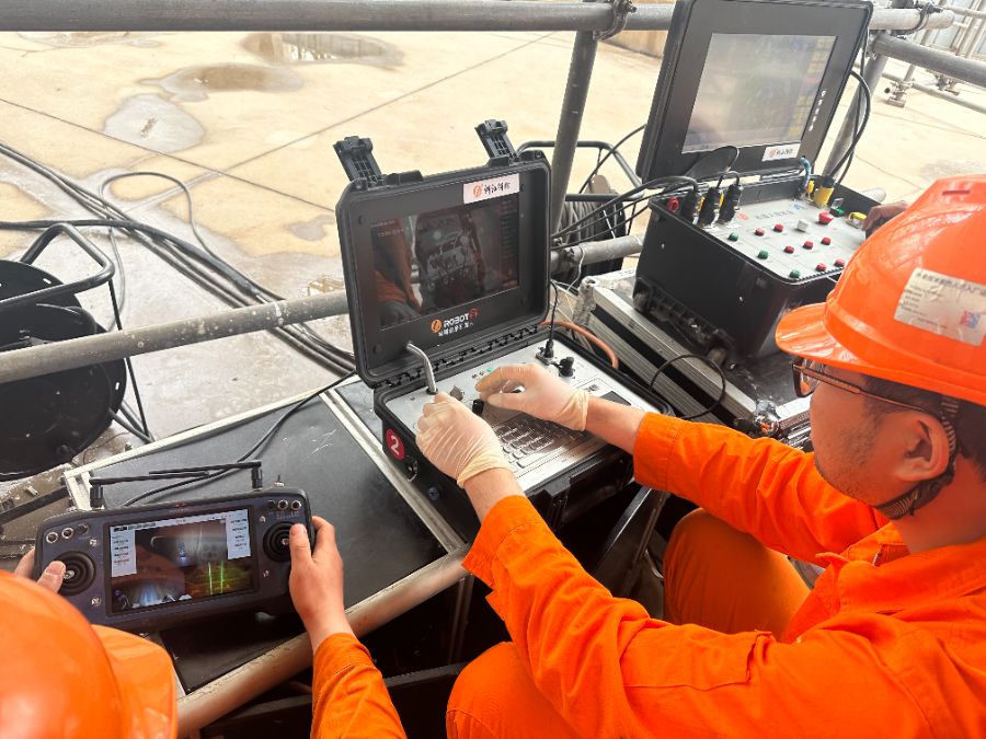 一座3000立方米的球罐外,技术人员正注视着屏幕,手指轻触操控面板。球罐内,爬壁打磨机器人和爬壁磁粉检测机器人正在协同作业。