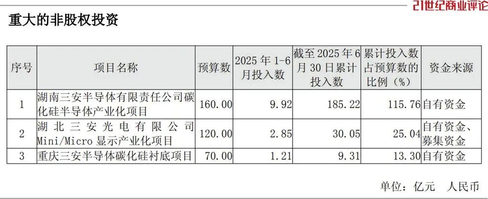 湖北三安Mini/Micro显示产业化项目,总投资120亿元,截至2025年6月,已投入30亿元,净利润0.88亿元。
