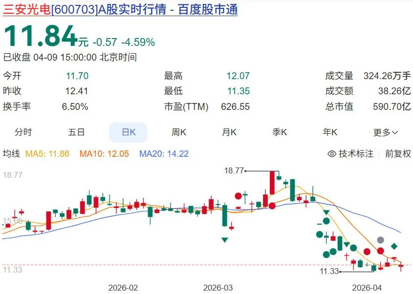 3月23日至4月9日收盘,三安光电股价下跌28%,市值蒸发超230亿元。