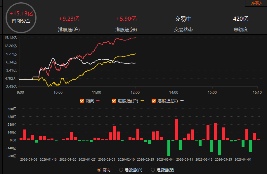 南向资金早盘明显缩量,净买入额为15.13亿港元。