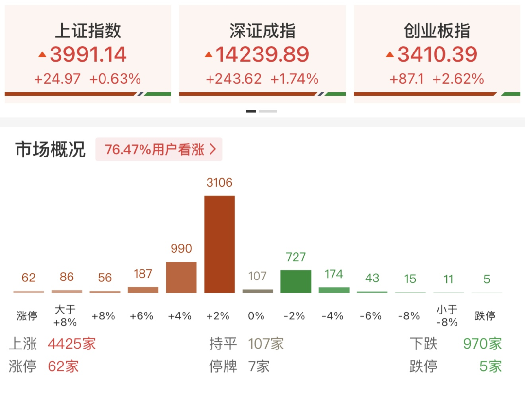 从板块来看, 电池产业链全线走强, 国轩高科、上海洗霸、信宇人、大东南等多股涨停。 光伏、储能概念持续走高, 亿晶光电、德业股份涨停。燃气轮机概念表现活跃,万泽股份、联德股份3天2板。金融板块盘中异动拉升,南华期货涨停,哈投股份触及涨停。 下跌方面,光纤概念震荡走弱,汇源通信跌停,法尔胜盘中逼近跌停。截至收盘,沪指涨0.63%,深成指涨1.74%,创业板指涨2.62%。