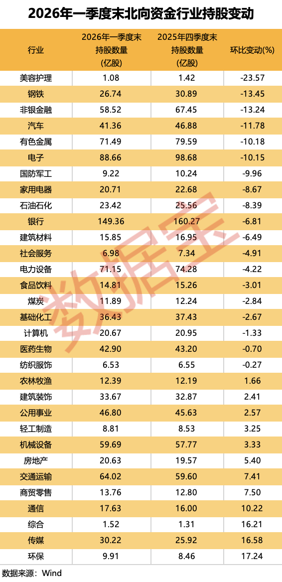 截至2026年一季度末,北向资金持有的非银金融行业股票数量为58.52亿股,持有的银行行业股票数量为149.36亿股,两者均创近5个季度新低,前者环比下降13.24%,后者环比下降近7%。与此同时,美容护理、家用电器、食品饮料等行业也遭北向资金减持。