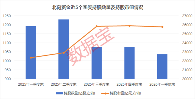 截至2026年一季度末,北向资金持股数量接近1037亿股,环比下降近4%,持股数量创近5个季度新低;同期持股市值2.58万亿元,回落至近3个季度以来新低。