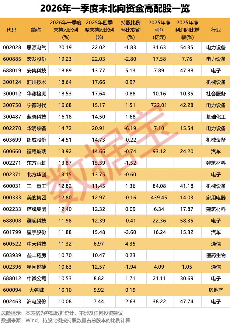 据数据宝统计,以持股数量占总股本比例来看,截至2026年一季度末,23家公司北向资金持股比例均超过10%,主要分布于电子、电力设备、机械设备等行业。