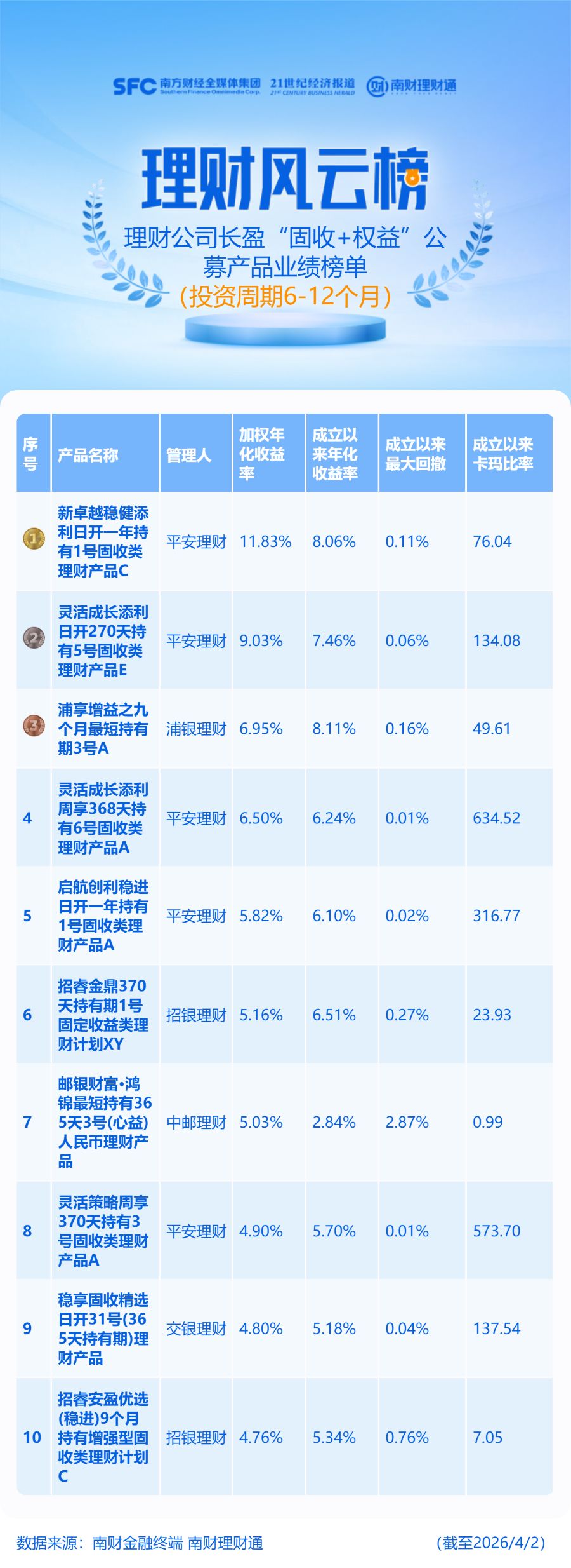 榜单数据说明:统计对象为理财公司发行的成立满1年的投资周期在6-12个月(含)的公募“固收+权益”产品,同系列同投资周期产品保留一只,加权平均收益率计算方式为“5%×近1月年化收益率+10%×近3月年化收益率+15%×近6月年化收益率+30%×近1年年化收益率+40%×成立以来年化收益率”,排名依据为加权年化收益率,数据计算截止时间为2026年4月2日。榜单排名由理财通AI全自动化实时排名,如您对数据有疑问,请在文末联系助理进一步核实。