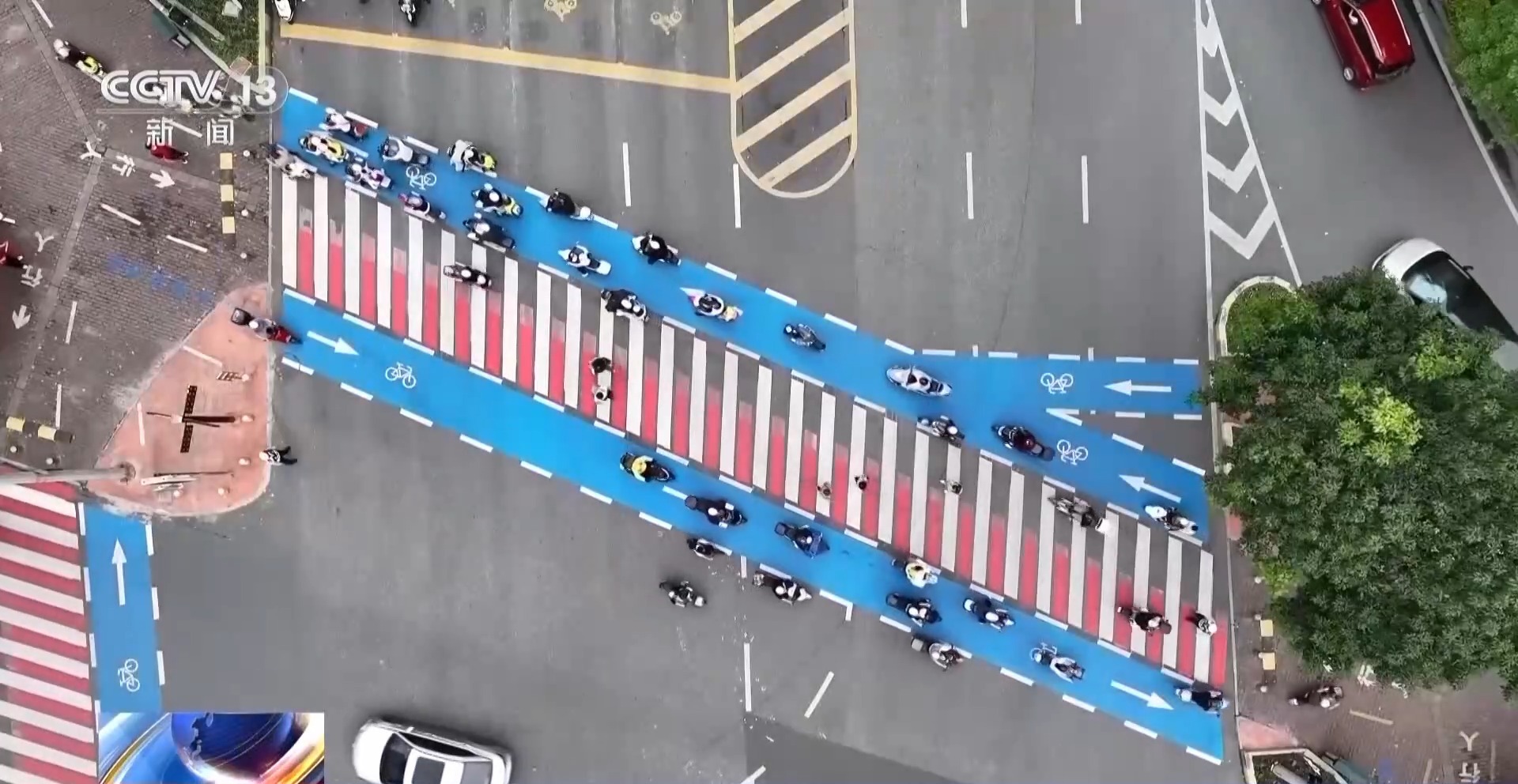 “蓝道过街”通过清晰标线实现有序通行:行人沿斑马线通行,非机动车走两侧蓝道,机动车道前方设置摩托车待行区。红灯等候、绿灯通行时各归其道,既规范了通行秩序,又提升了通行的安全与效率。