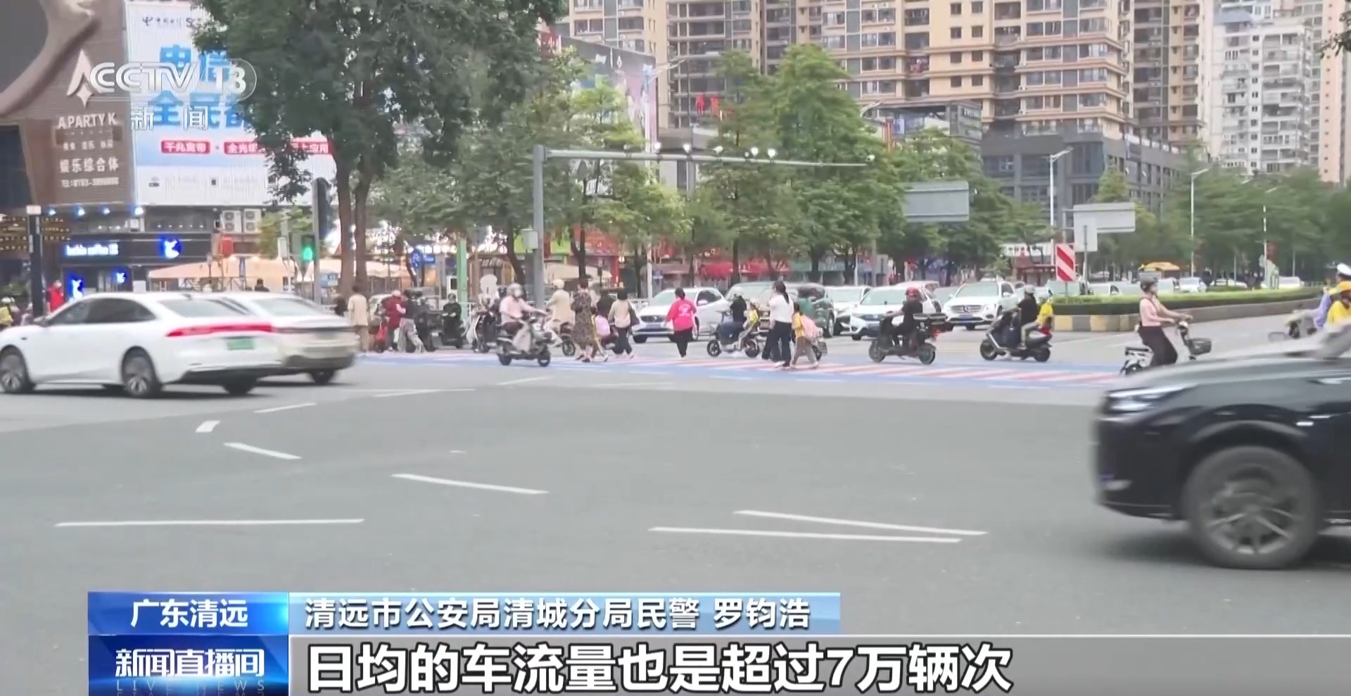 清远市公安局清城分局民警 罗钧浩:这个路口也是平时南北交通的重要枢纽之一,周边聚集了大量的小区、学校以及写字楼,日均的车流量也是超过7万辆次,行人以及非机动车也达到每小时4000辆次,因此它的交通压力是比较大的。