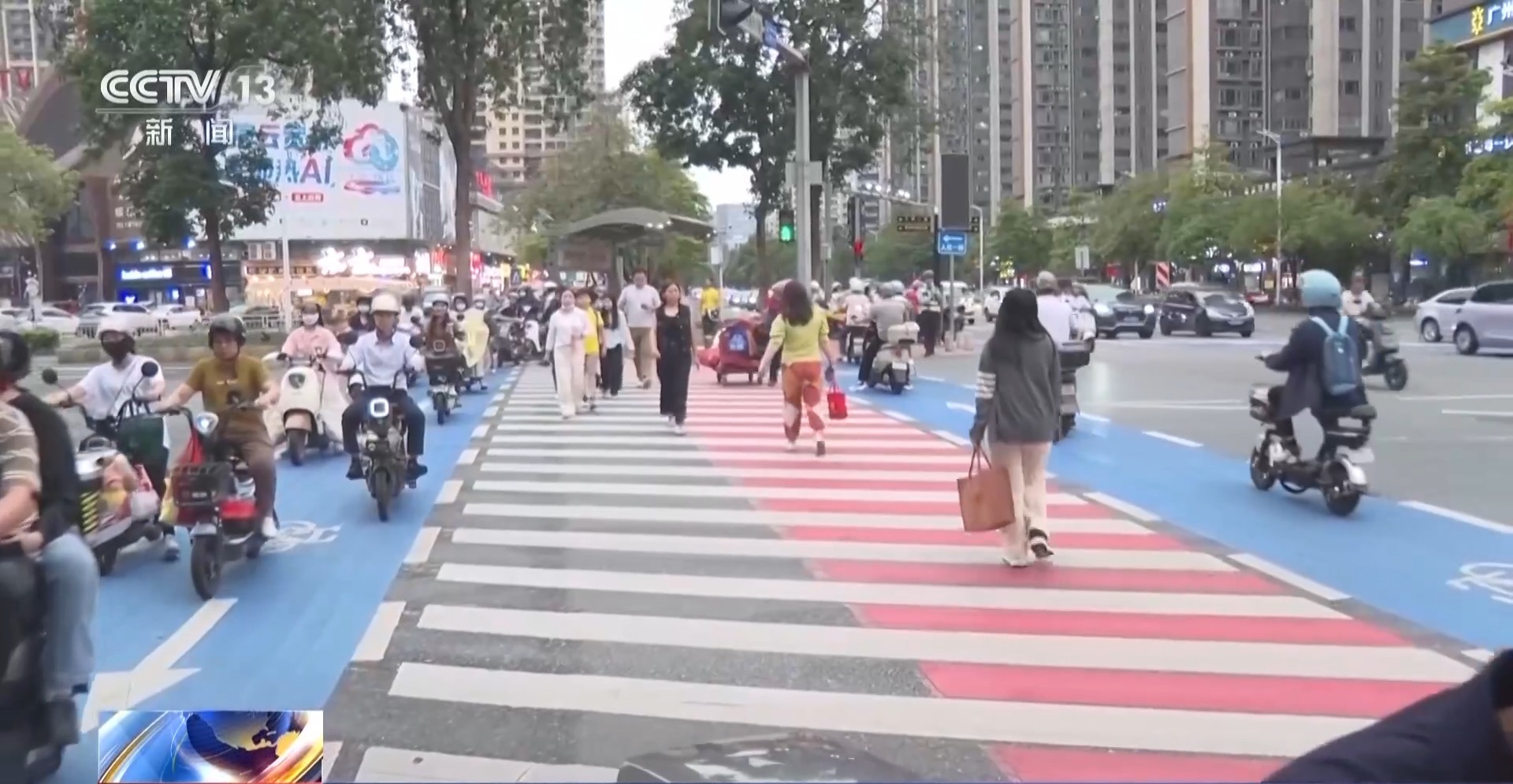 清远市清城区副区长 蓝建飞:在斑马线两侧划出蓝色的非机动车专用道,其次把安全岛的花坛移走,等候区扩大两到三倍,人车不再外溢到马路上,最后同步调整了红绿灯的配时。通过三个小调整,不动大手术,把路权理顺了,空间腾了出来,改造后早晚高峰期通行效率提升了50%以上,机动车平均等候时间缩短了一到两个信号灯周期。