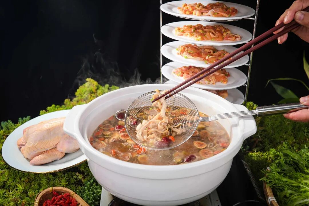 于是供应链出手了。像美鑫餐调推出的无花果鸡汤底料,在保证鸡汤清鲜浓香的同时,门店只需要另加红枣、枸杞即可出餐。这款底料还可衍生出五指毛桃鸡汤火锅、无花果山野菌菇火锅等,像中式粉面、日式汤面的汤底,或者米饭快餐的炖品都能用。