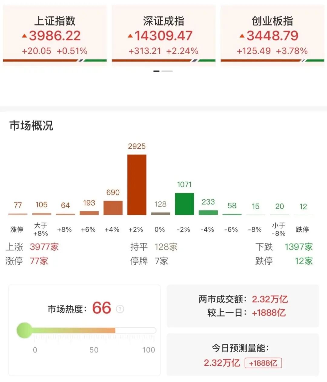 盘面上,市场热点快速轮动, 全市场超3900只个股上涨。 从板块来看, 电池产业链全线走强 ,石大胜华、国轩高科、上海洗霸、大东南等多股涨停。CPO概念快速走高,源杰科技涨超8%创历史新高,新易盛总市值突破5000亿。燃气轮机概念表现活跃,万泽股份、联德股份3天2板。金融板块盘中异动拉升,南华期货涨停,哈投股份触及涨停。