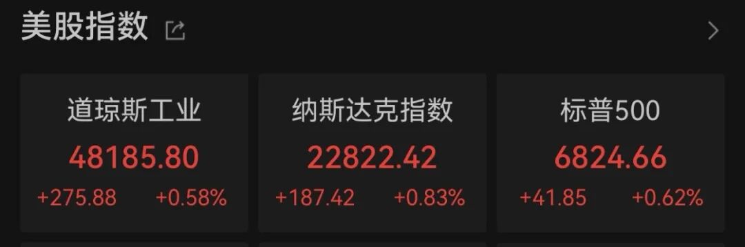 当地时间4月9日,美股三大指数全线上扬。Wind数据显示,道琼斯工业平均指数上涨0.58%,报48185.80点;标普500指数上涨0.62%,报6824.66点;纳斯达克综合指数上涨0.83%,报22822.42点。其中,标普500指数与纳指双双连续7个交易日实现上涨,道指连续7个交易日中有6个交易日实现上涨,显示出市场情绪的持续修复。