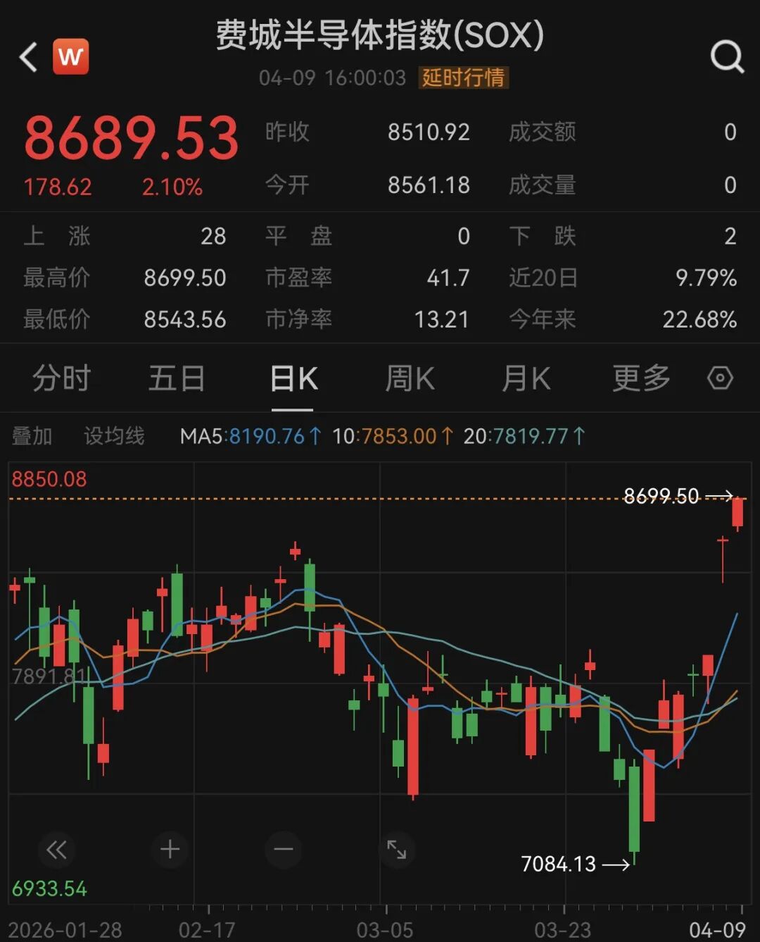 当地时间4月9日,美股三大指数延续涨势,标普500指数与纳斯达克指数实现连续第7个交易日上涨,大型科技股、芯片股多数上涨。