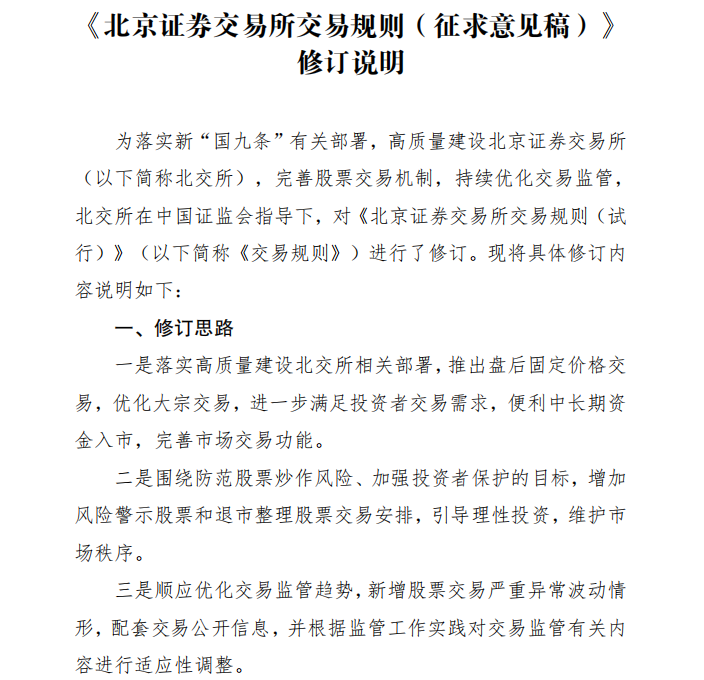 北交所表示,本次公开征求意见结束后,北交所将根据意见反馈情况进一步完善《交易规则》,履行有关程序后发布实施。