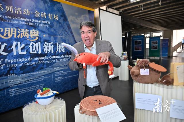 在巴西举办的“欢朋满粤”岭南文化创新展上,国际乒乓球联合会副主席阿拉尔 · 阿泽维多打卡东莞潮玩。