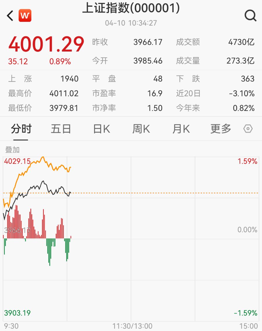4月10日,沪指一度涨超1%,时隔14个交易日重回4000点。板块上,“牛市旗手”券商板块狂飙,电工电网、能源设备、电脑硬件等多个板块涨幅居前。