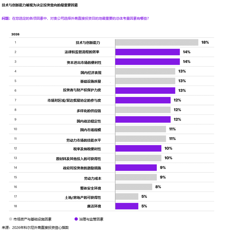 技术与创新能力已跃升至企业选择投资目的地的首要考量因素,超过监管程序效率和国内经济表现等传统考量指标。在最具外资吸引力的 25个市场中,有10个市场的投资者将技术创新列为在当地投资的首要或并列首要理由,这凸显出创新生态系统在吸引全球资本方面的重要性正日益提升。随着全球人工智能、数字基础设施及数据驱动技术投资持续加速,具备强大创新生态体系的市场正成为最受欢迎的长期投资目的地。