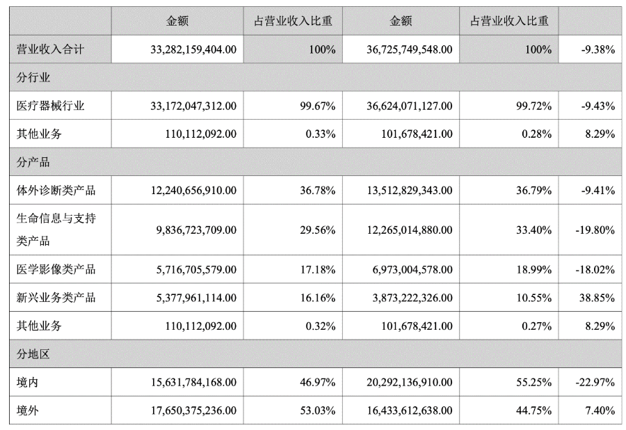 从具体业务来看,迈瑞医疗的体外诊断业务、生命信息与支持业务、医学影像业务营收分别为122.41亿元、98.37亿元、57.17亿元,分别同比下降9.41%、19.8%、18.02%。