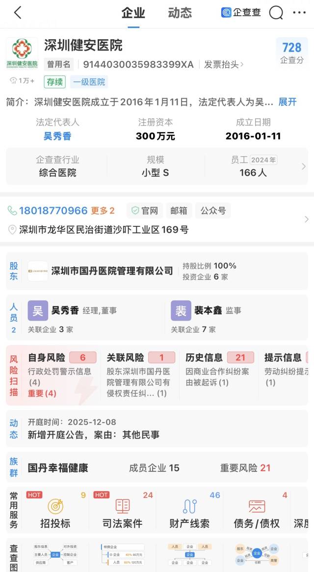 企查查信息显示,深圳健安医院为注册资本300万元的一级综合医院,法定代表人为吴秀香。据医院公众号介绍,其2004年12月成立,2005年成为深圳首批120 急救网络医院,更曾连续7年拿下深圳市急诊与院前急救双A先进称号。