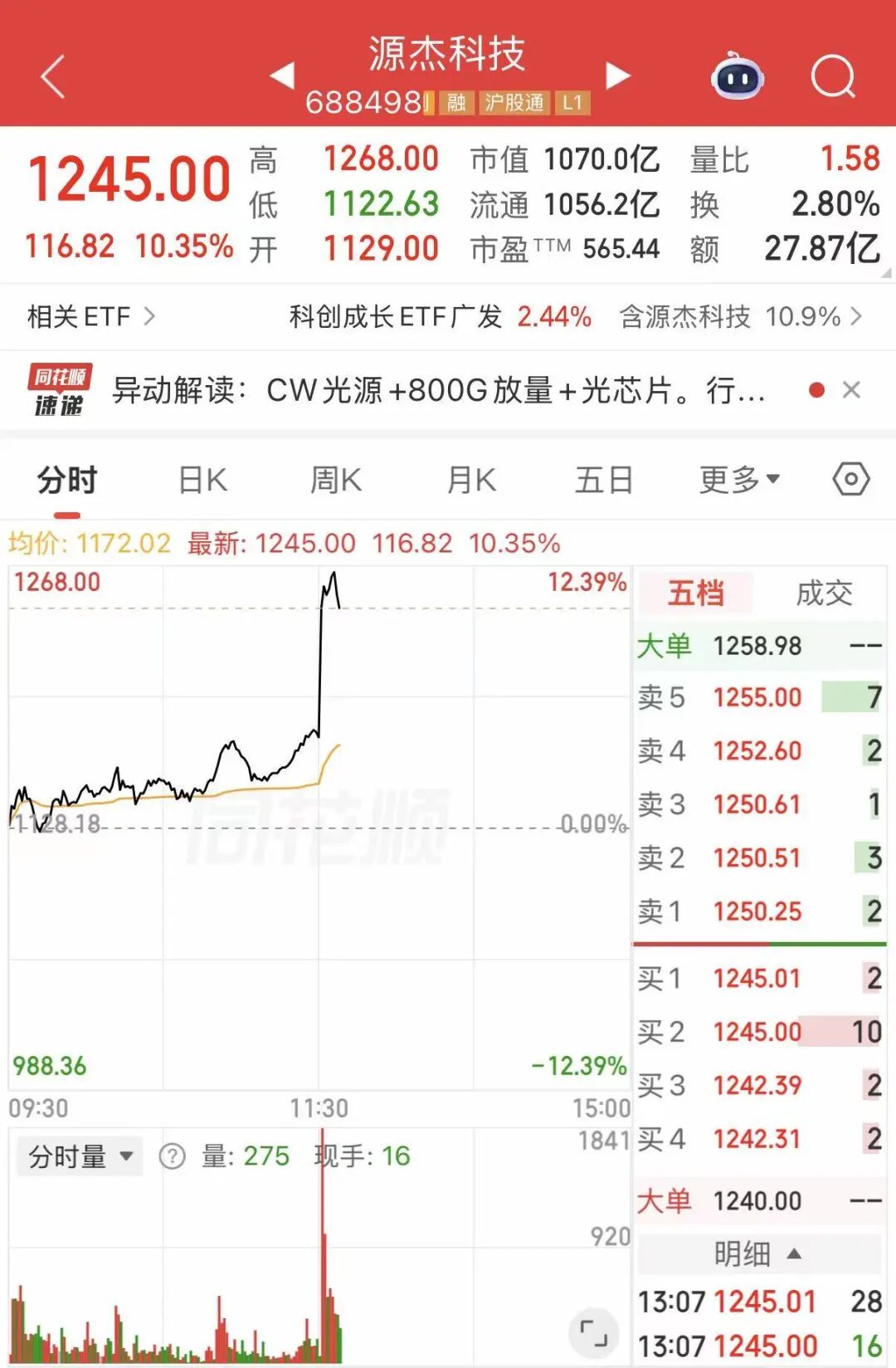 10日午后,CPO、光模块等算力硬件股短线走高,源杰科技(688498)直线拉升,截至发稿 涨超10% ,报1245元/股,股价创历史新高。永鼎股份、东山精密、长光华芯、生益电子纷纷拉升。