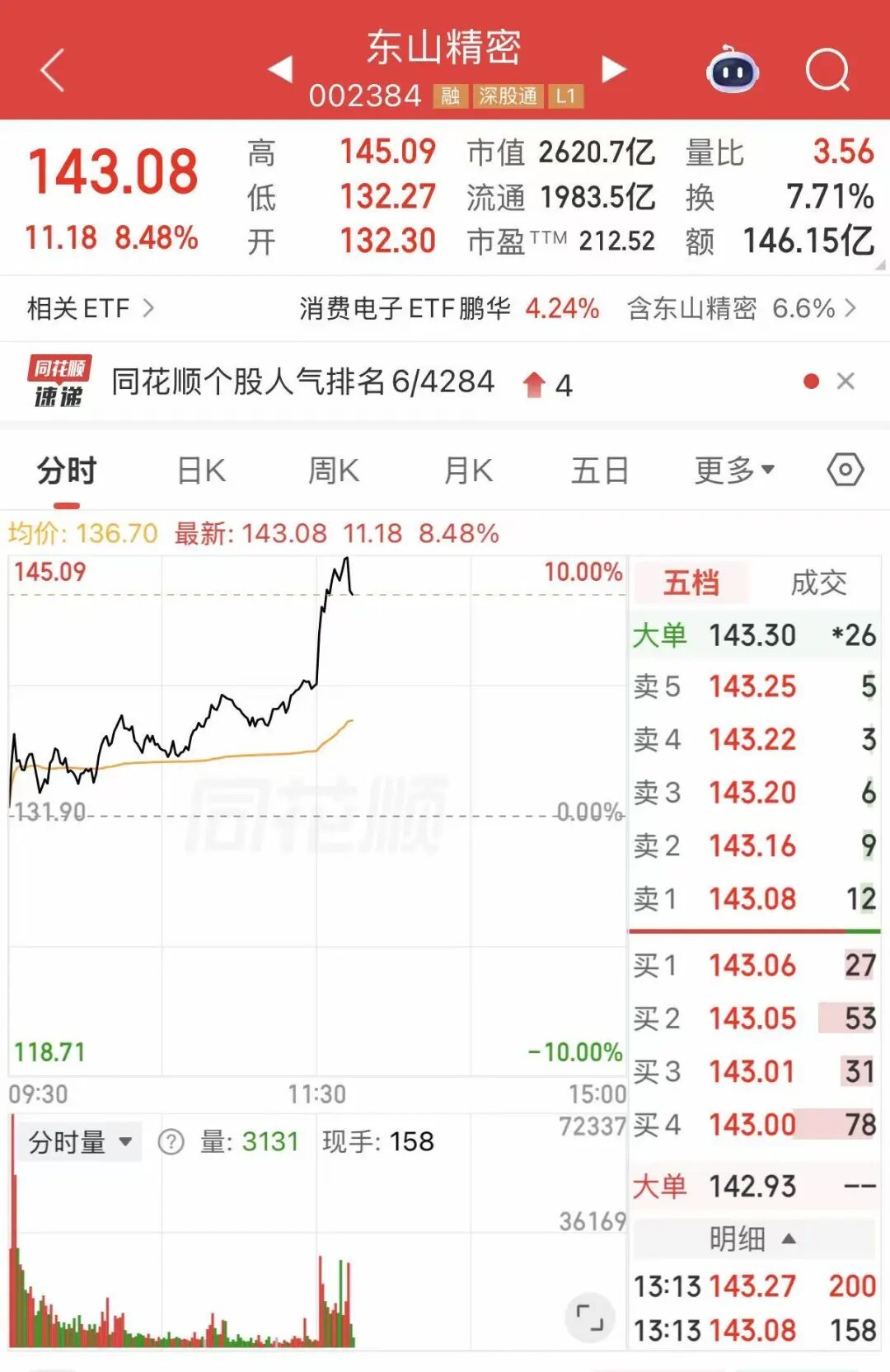 东山精密午后也持续走高,截至发稿涨近9%,最新总市值超2600亿元。