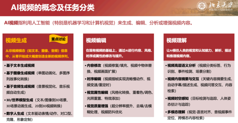 按照北大《AI视频生成技术原理与行业应用》报告的定义,AI视频是用机器学习、计算机视觉完成视频的生成、编辑、分析与增强,核心分为文生视频、图生视频、视频转视频三类。