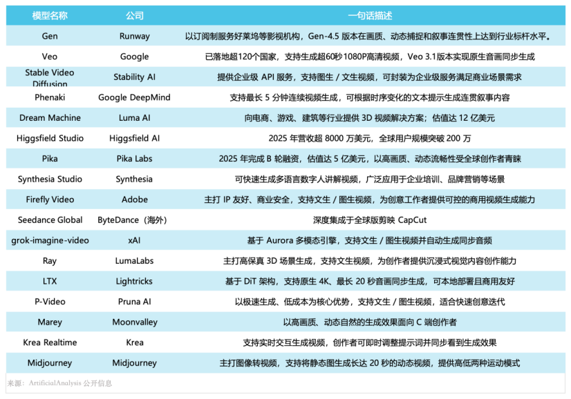 PixVerse | 爱诗科技 | 2026 年 1 月完成 3 亿美元融资,刷新亚洲 AI 视频融资纪录;主打多模态引擎与 4K 极速生成,拥有全球海量用户与特效模板库 |