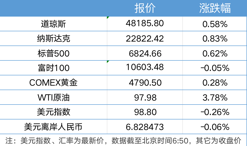 1、美股三大指数收盘集体收涨,纳指涨0.83%,标普500指数涨0.62%,道指涨0.58%,其中,纳指、标普500指数录得七连涨;科技股普涨,闪迪涨超9%,亚马逊涨超5%,英特尔涨超4%,美光科技、应用材料涨超3%,奈飞、Meta、AMD涨超2%。