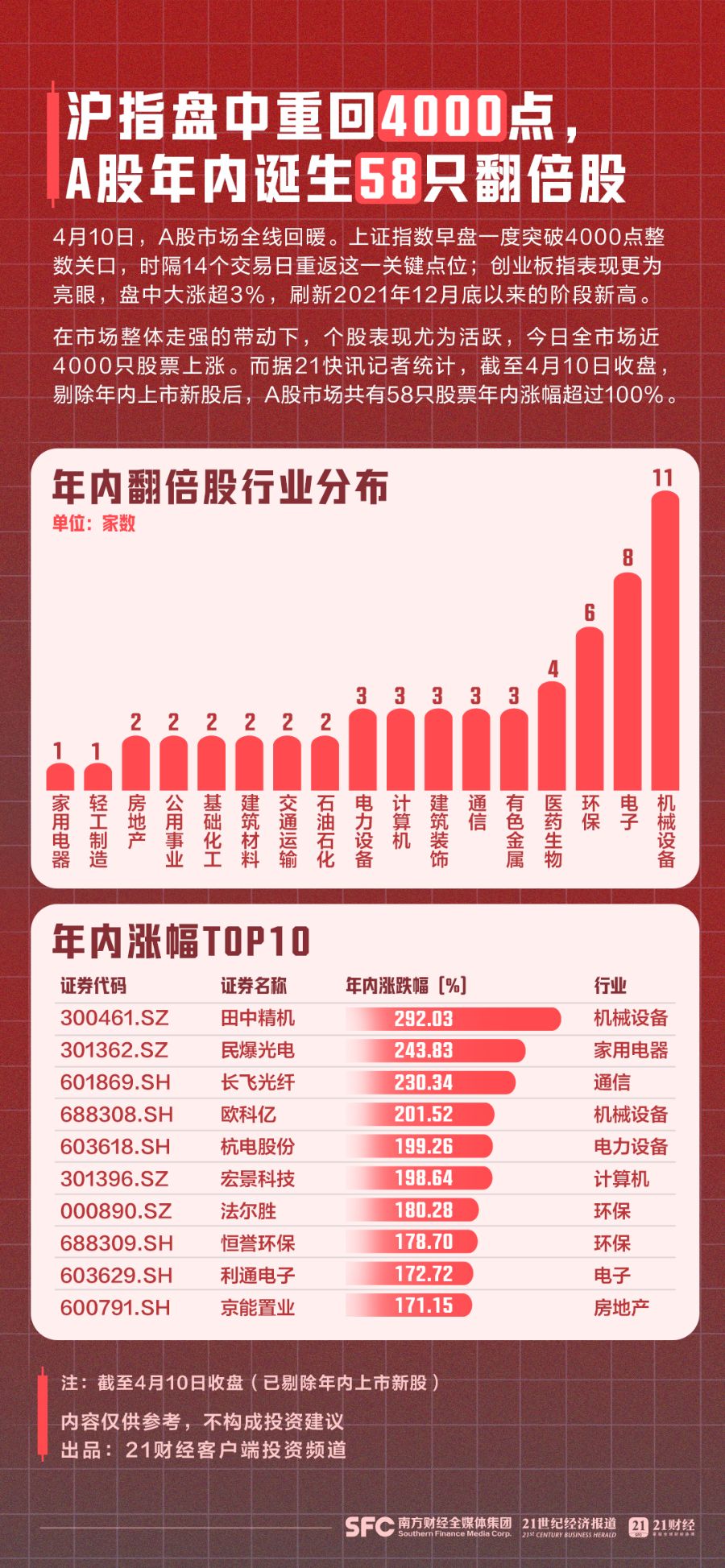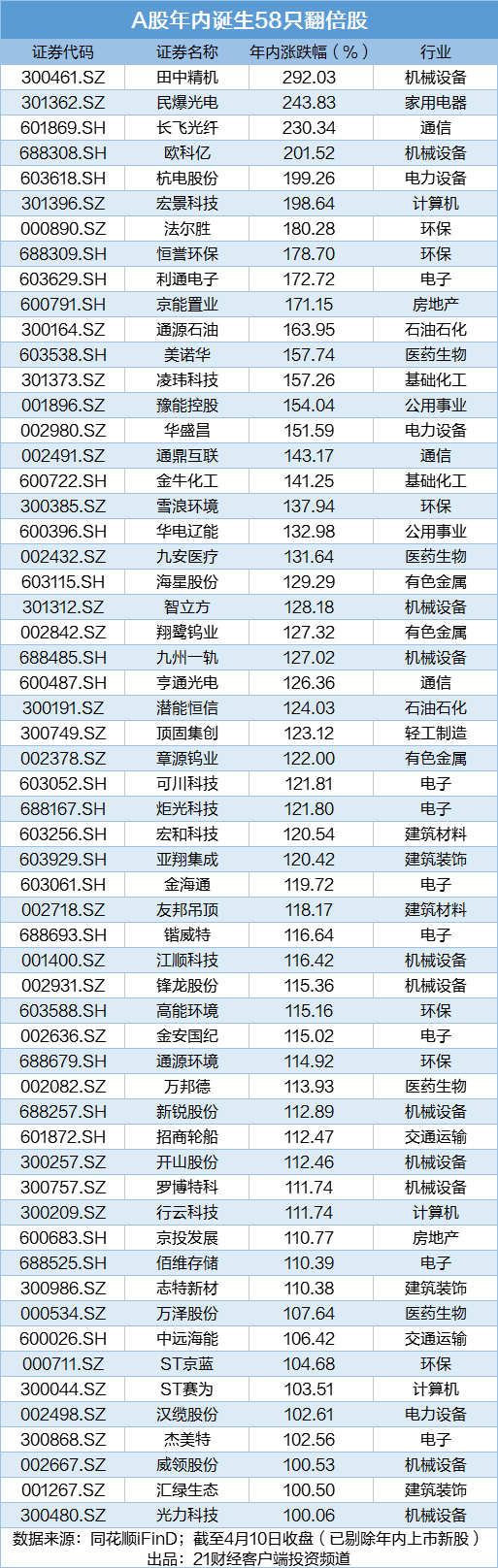 在市场整体走强的带动下,个股表现尤为活跃。据21快讯记者统计,截至4月10日收盘,剔除年内上市新股后,A股市场共有58只股票年内涨幅超过100%。