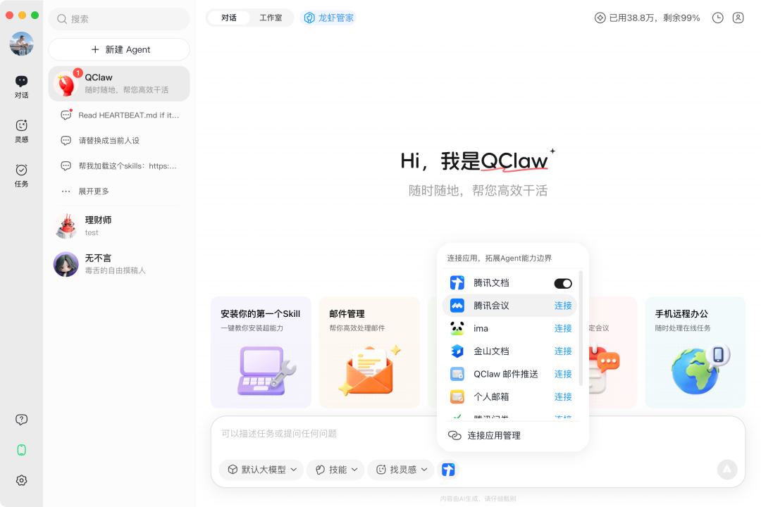 除了多Agent机制外,QClaw引入了“连接器”功能,尝试打通AI与第三方应用之间的数据与操作链路,并已接入腾讯文档、腾讯问卷、腾讯会议、ima知识库、金山文档、Notion等应用。目前,用户可在QClaw对话界面直接完成跨应用操作,据腾讯方面测算,单任务操作步骤预计减少60%以上。