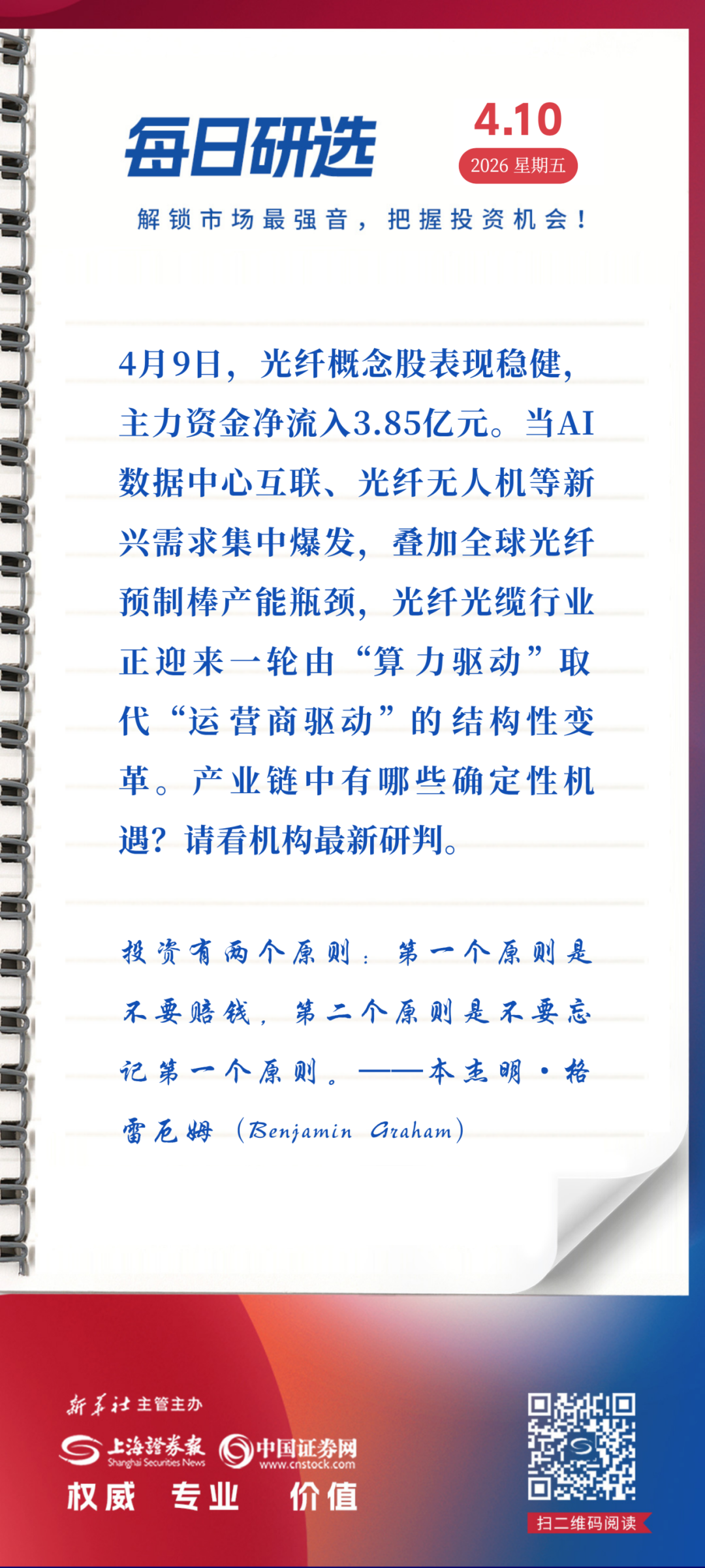 4月9日,光纤概念股表现稳健,主力资金净流入3.85亿元。当AI数据中心互联、光纤无人机等新兴需求集中爆发,叠加全球光纤预制棒产能瓶颈,光纤光缆行业正迎来一轮由“算力驱动”取代“运营商驱动”的结构性变革。产业链中有哪些确定性机遇?请看机构最新研判。