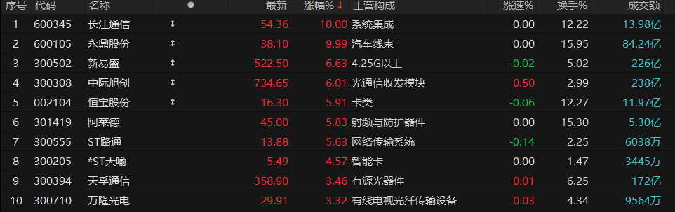 4月10日,通信设备板块午后震荡走强,长江通信、永鼎股份涨停,恒宝股份、新易盛、中际旭创等跟涨。